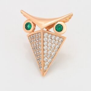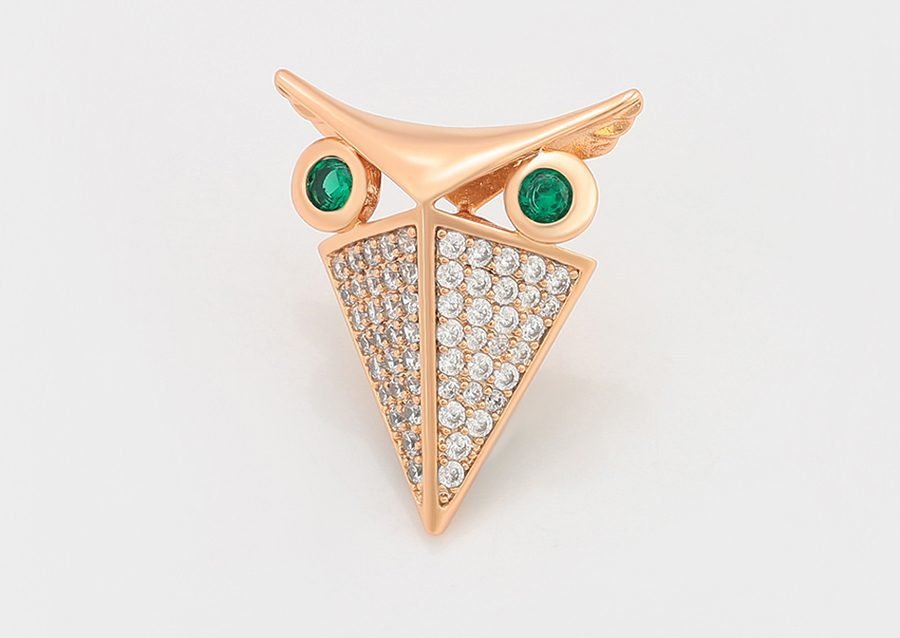 Brosh në formë Huti, i praruar në ar 18 karatësh me gurë të gjelbërt dhe të bardhë sintetik.