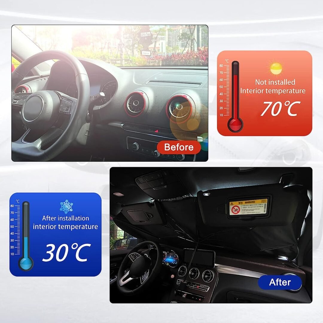 MBROJTJA NGA DIELLI: Çadra e mbrojtjes nga dielli me cilësi të lartë jo vetëm që reflekton në mënyrë perfekte dritat e diellit, por gjithashtu parandalon zbehjen e pultit dhe tapiceri dhe plasaritjen, plus shkurton ndjeshëm kohën e nevojshme për të ftohur automjetin tuaj.