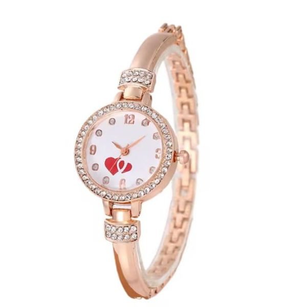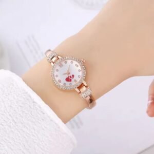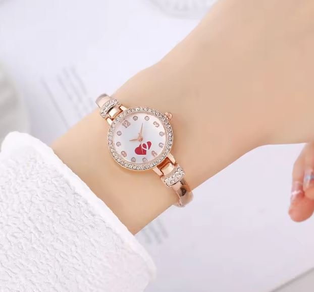 Brenda ekranit, numrat dhe shenjat për orët janë gjithashtu të zbukuruar me gurë shkëlqyes, ndërsa dy zemra të kuqe të vendosura në qendër shtojnë një element romantik dhe të veçantë në dizajn. Rripi i orës është i bërë nga një material i butë dhe elegant, që i përshtatet në mënyrë të përsosur dorës dhe siguron komoditet gjatë gjithë ditës.
