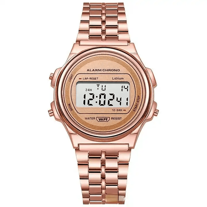 Orë dore për meshkuj dhe femra, model vintage. Ora tregon kohen, daten dhe ka alarm. Ora funksionon me bateri dhe ka rezistencë ndaj ujit.