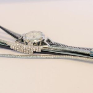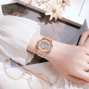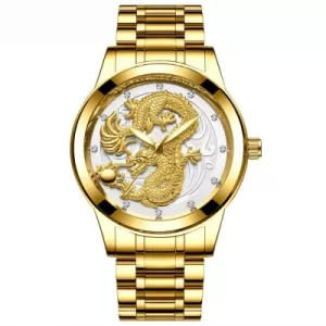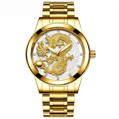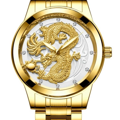 Kjo orë tërheqëse përmban një dragua të artë të hollësishëm të vendosur mbi një sfond të bardhë të ndritshëm, që i jep një pamje të pastër dhe të rafinuar. Detajet e dragonit janë të theksuara me kujdes për të përfaqësuar fuqinë dhe elegancën. Rrethi i mostrës është i dekoruar me gurë të vegjël që shkëlqejnë në çdo lëvizje, ndërsa rripi është i përbërë nga metali i artë me një përfundim të lëmuar dhe luksoz. Kjo orë është ideale për ata që kërkojnë një aksesor të ndritshëm dhe të veçantë që tërheq vëmendjen në çdo moment.