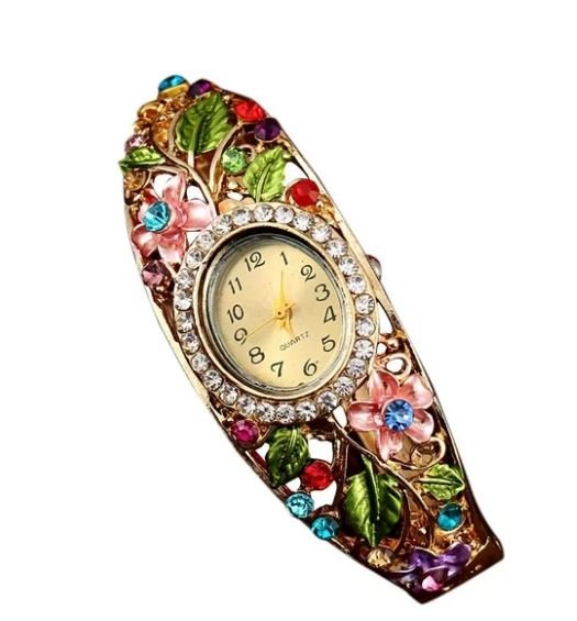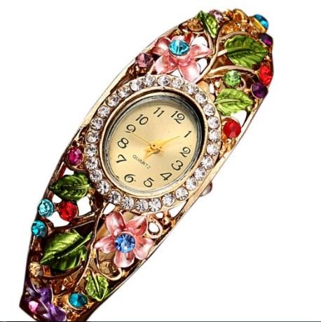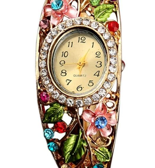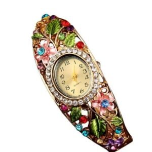 Ora elegante me një dizajn të bukur lulesh dhe gurësh shumëngjyrësh është mjaft glamuroze dhe mbresëlënëse. Ka një fushë numrash të artë të rrethuar nga gurë vezullues që shtojnë shkëlqim dhe elegancë. Rripi është i dekoruar me motive lulesh të ngjyrosura, duke ofruar një pamje artistike dhe të rafinuar. Perfekte për të shtuar një prekje të veçantë dhe të sofistikuar në çdo rast, kjo orë është një kombinim ideal i bukurisë, funksionalitetit dhe tërheqjes së vëmendjes.