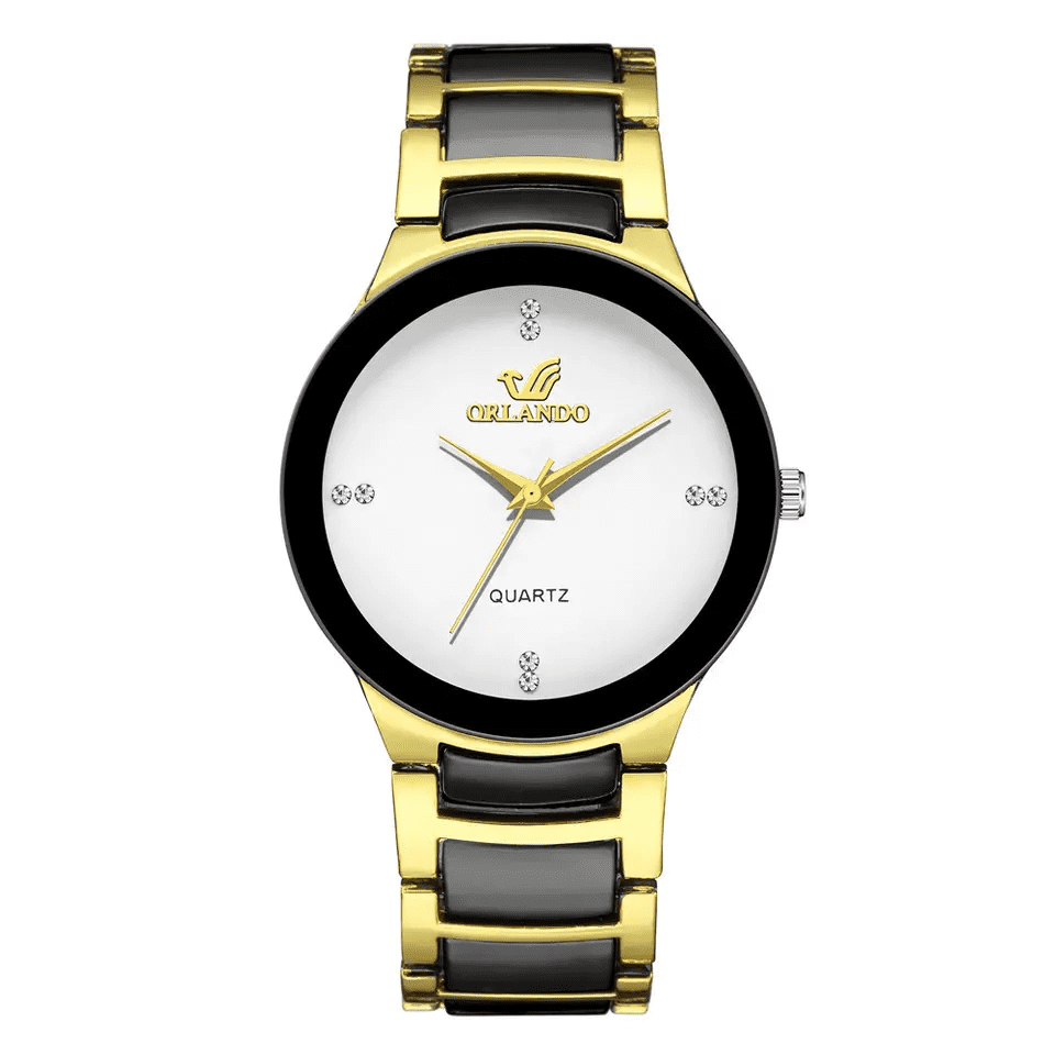 Orë dore me dizajn modern. Rrip metali ngjyrë e zezë, e bardhë dhe e artë. Fusha e numrave e bardhë e dekoruar me gurë sintetik.