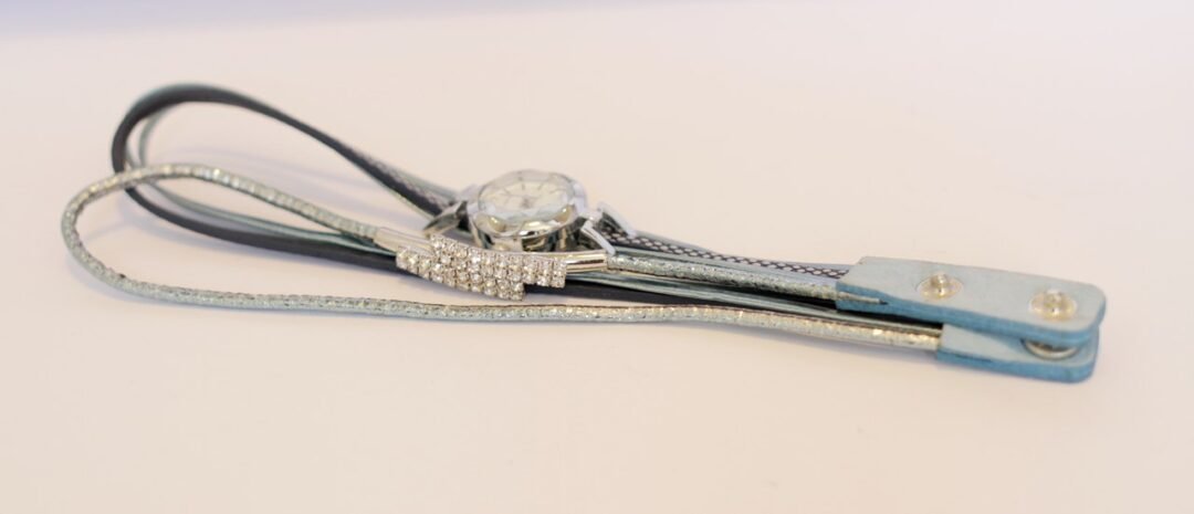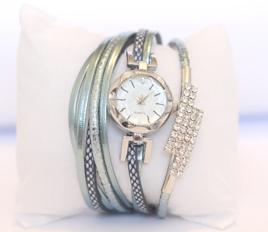Byzylyk dore me orë me bateri. Bylyzyku është i dekoruar me gurë të vegjël sintetikë. Ngjyra e byzylykut kaltër e vezulluar.