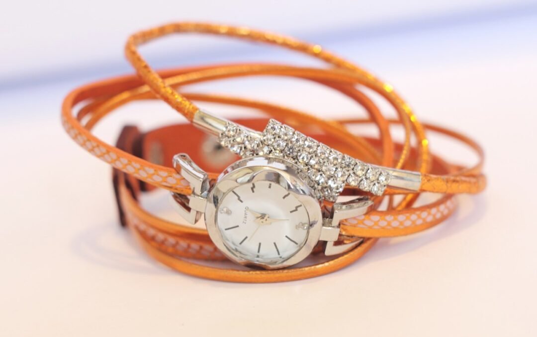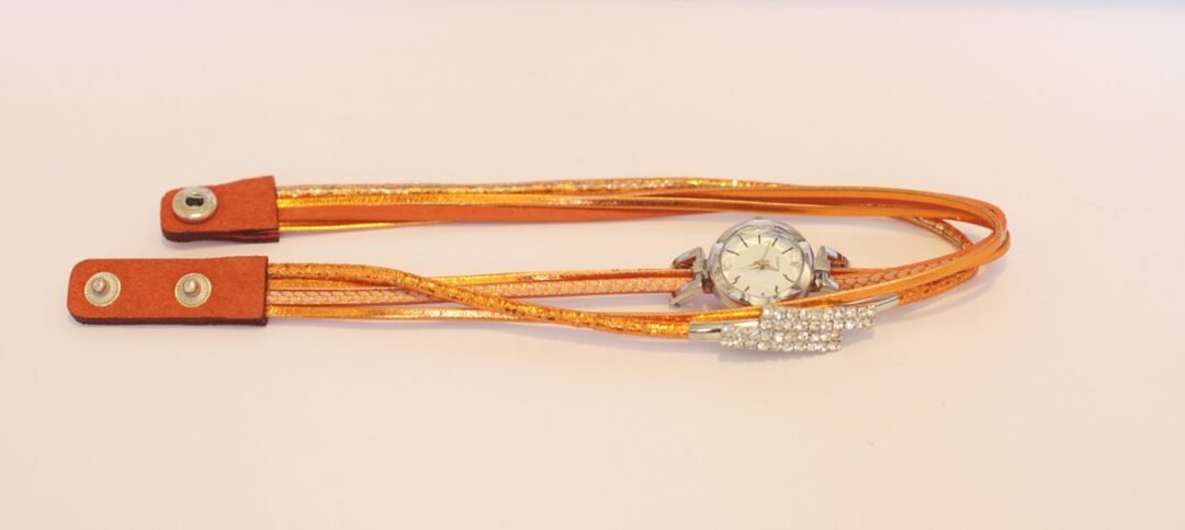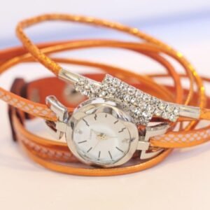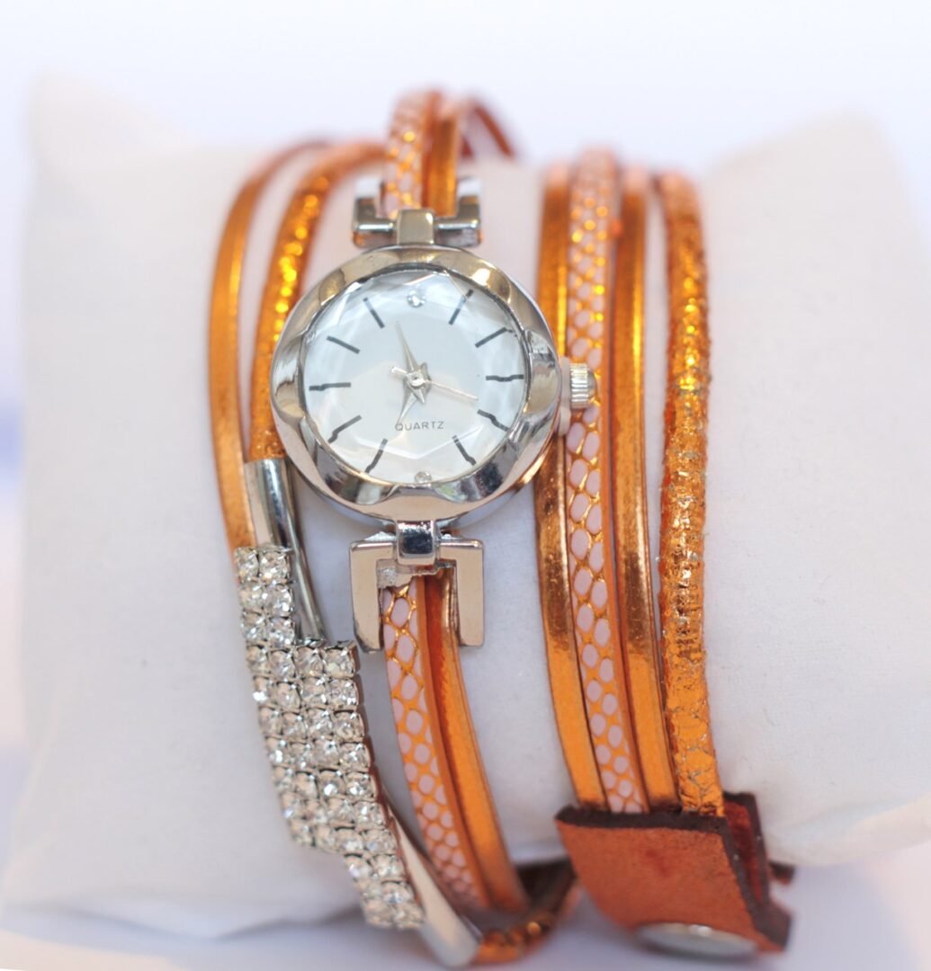 Byzylyk dore me orë me bateri. Bylyzyku është i dekoruar me gurë të vegjël sintetikë. Ngjyra e byzylykut portokalli apo ngjyrë bakri e vezulluar.