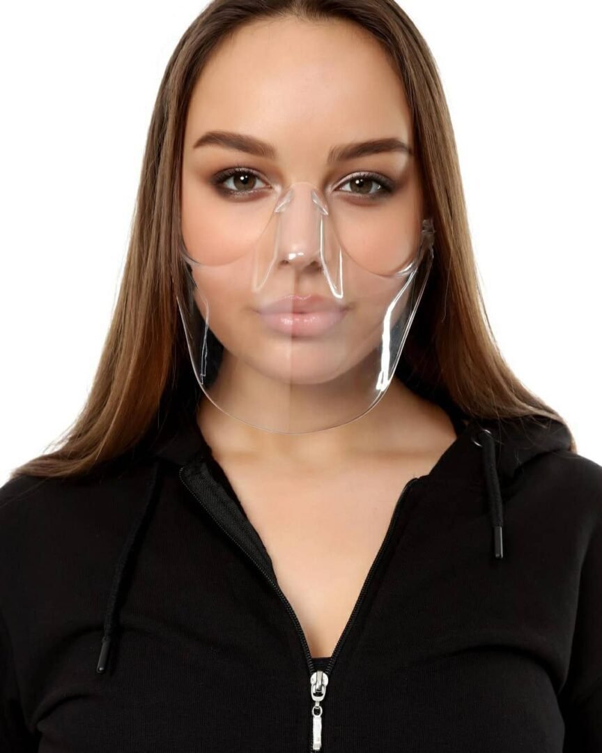 Maske transparente me mbajtese qe palohen. E dizajnuar me stil per te mos mbuluar buzeqeshjen.