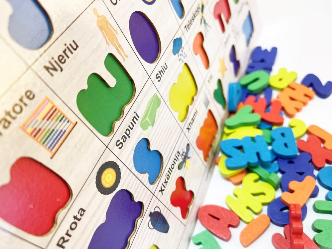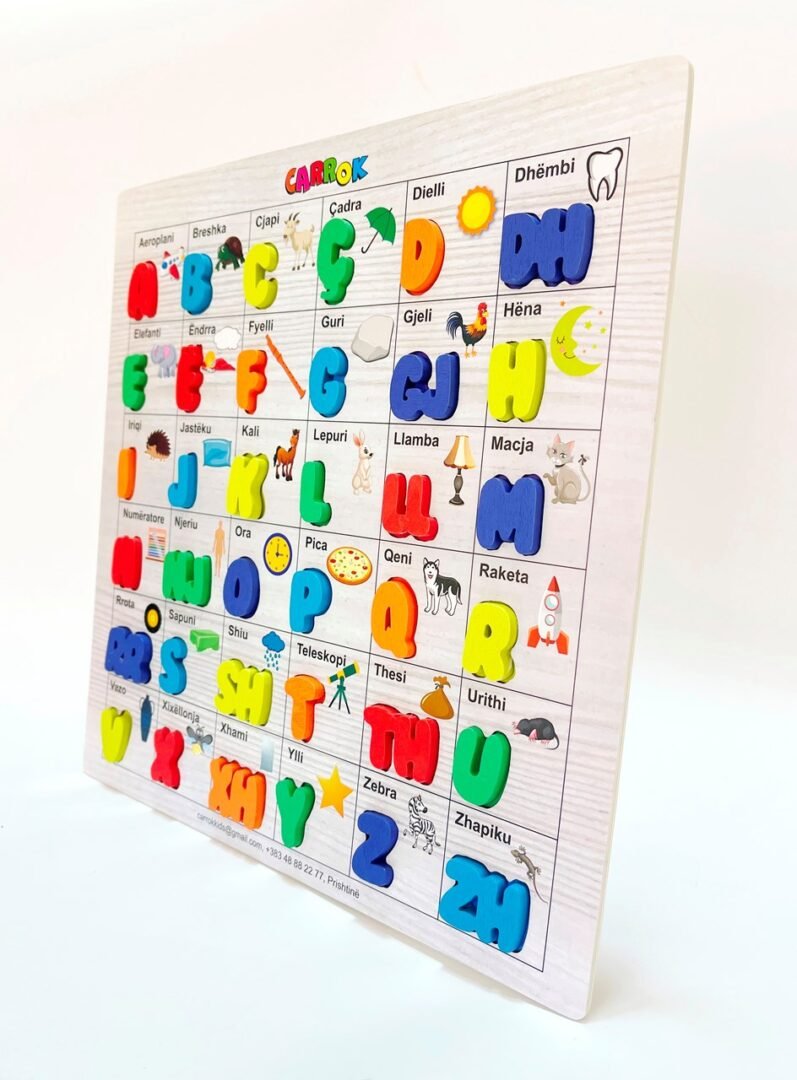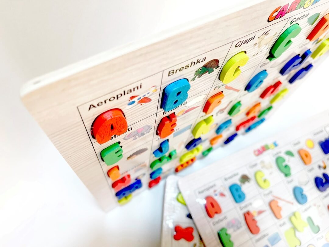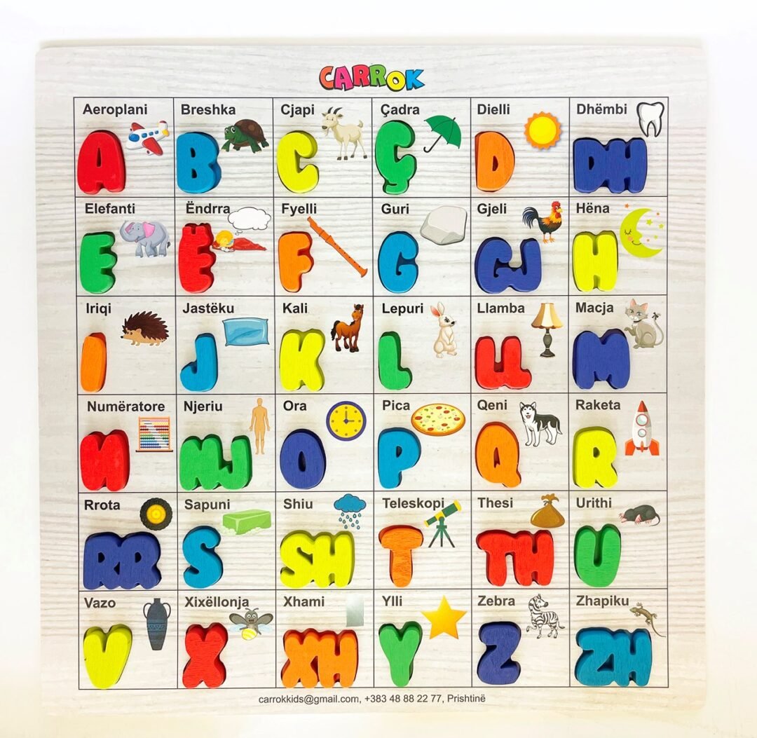 Puzzle alfabeti i gjuhës shqipe i punuar nga druri.