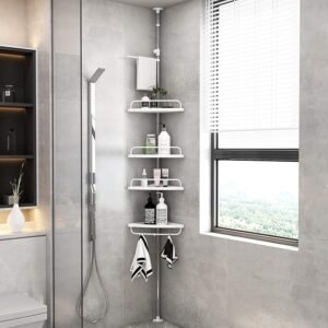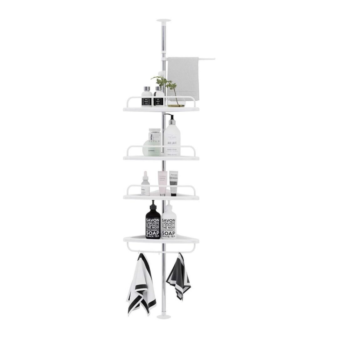 Ka 4 hapesira të zbrazëta në raft ku mund të vendosni shampon, xhelin e dushit dhe produktet e pastrimit. 4 tabaka me 3 grepa shtesë dhe rafte peshqirësh, çdo tabaka ka një shufer për të mbrojtur gjërat tuaja dhe për të varur peshqirët, është e lehtë për t’u montuar. Me manualin e përdoruesit mund ta montoni lehtësisht.
