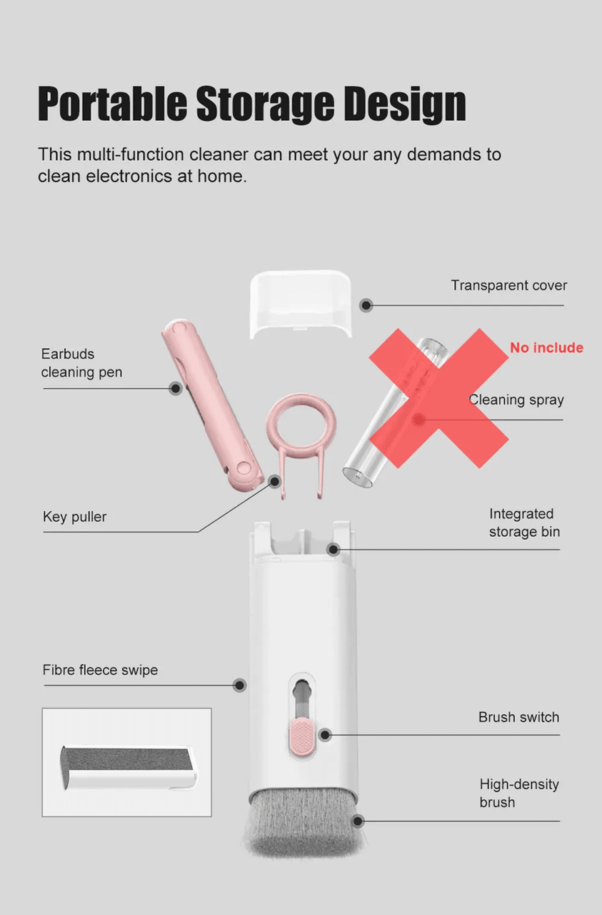 Përmban brushë nga fibra për pastrim, sfungjer anti-bakterial, sprej që mund të mbushet, brushë nga silikoni.